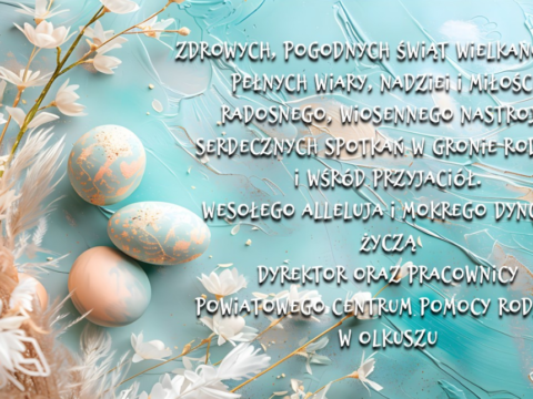 Zdrowych, pogodnych Świąt Wielkanocnych pełnych wiary, nadziei i miłości. Radosnego, wiosennego nastroju. Serdecznych spotkań w gronie rodziny i wśród przyjaciół. Wesołego Alleluja i mokrego dyngusa życzą Dyrektor oraz pracownicy Powiatowego Centrum Pomocy […]